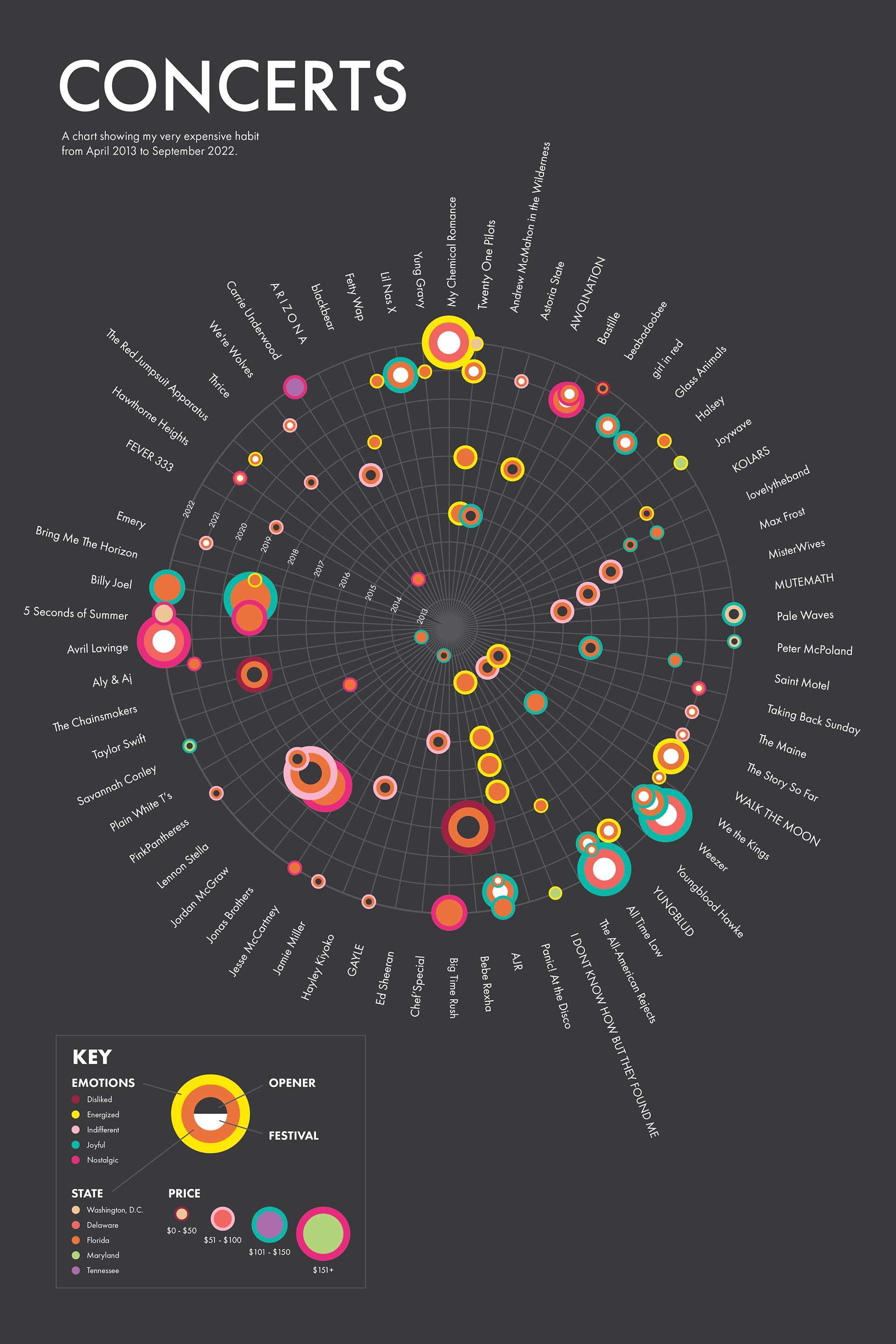 An infographic highlighting every concert I attended from April 2013 to September 2022.